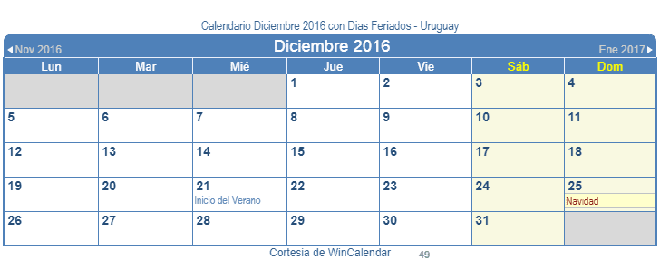 Calendario Diciembre 2016 para imprimir - con dias festivos y feriado Uruguay