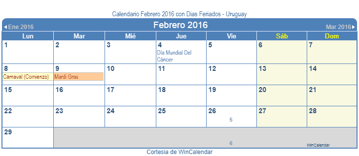 Calendario Febrero 2016 para imprimir - con dias festivos y feriado Uruguay