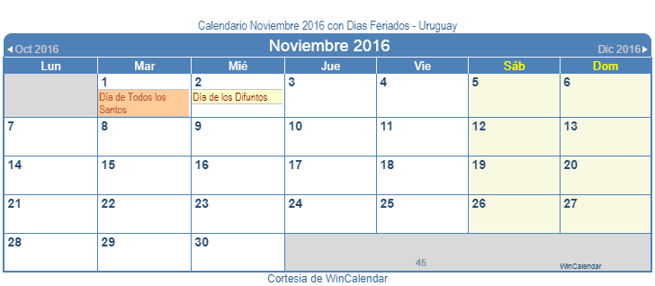 Calendario Noviembre 2016 para imprimir - con dias festivos y feriado Uruguay