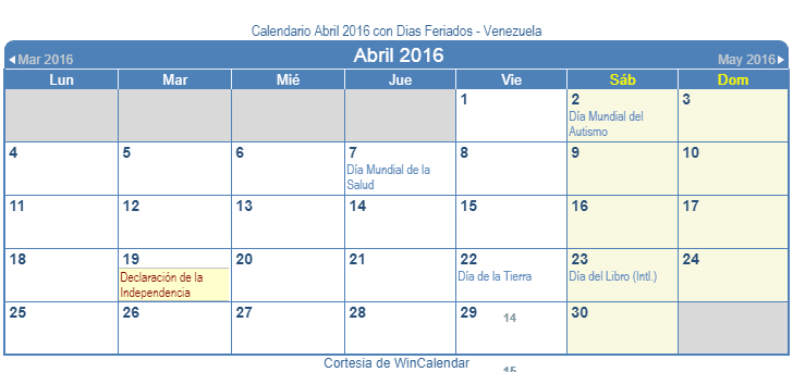 Calendario Abril 2016 para imprimir - con dias festivos y feriado Venezuela