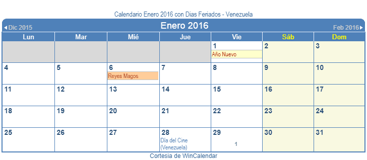 Calendario Enero 2016 para imprimir - con dias festivos y feriado Venezuela