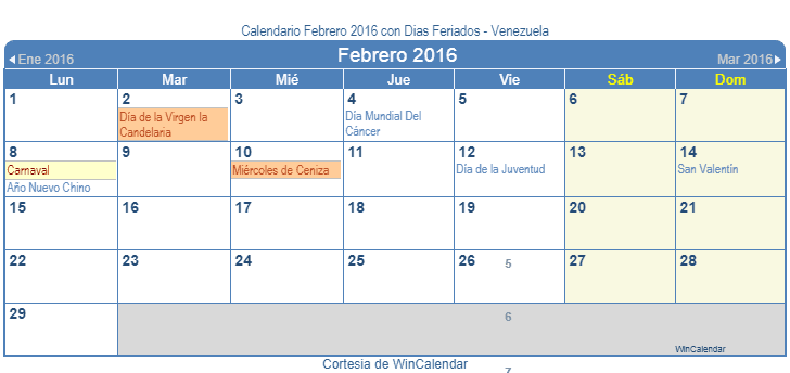 Calendario Febrero 2016 para imprimir - con dias festivos y feriado Venezuela