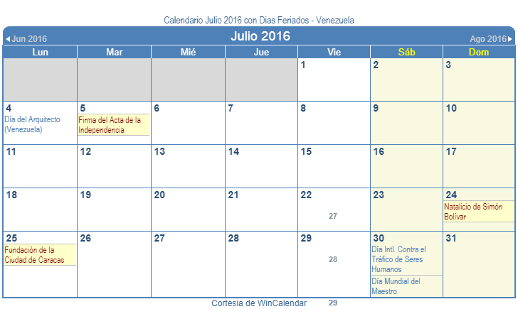 Calendario Julio 2016 para imprimir - con dias festivos y feriado Venezuela