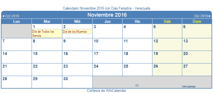 Calendario Noviembre 2016 para imprimir - con dias festivos y feriado Venezuela
