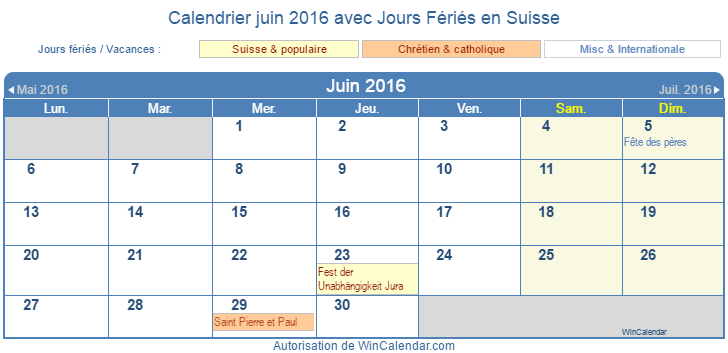 juin 2016 Calendrier à imprimer - Suisse