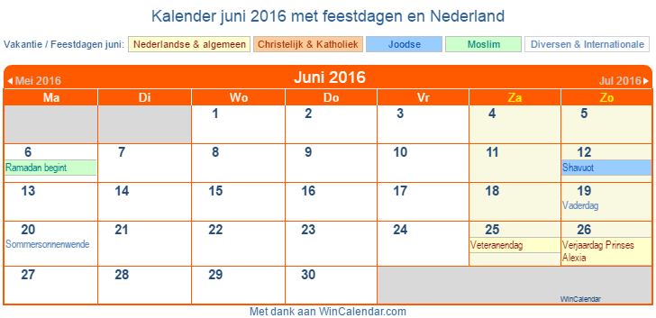Printable juni 2016 Kalender met feestdagen - Nederland
