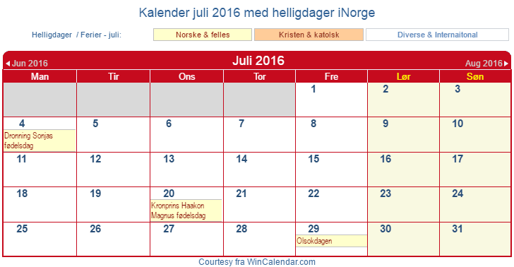 Tilbake til WinCalendar interaktiv NOR Kalender