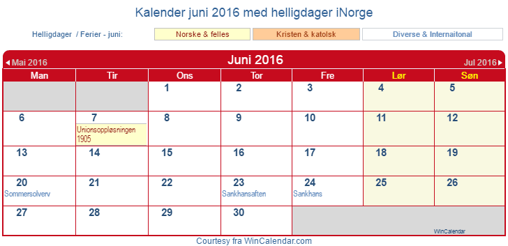 Tilbake til WinCalendar interaktiv NOR Kalender