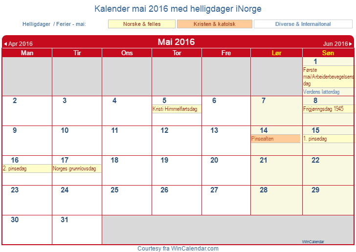 Tilbake til WinCalendar interaktiv NOR Kalender