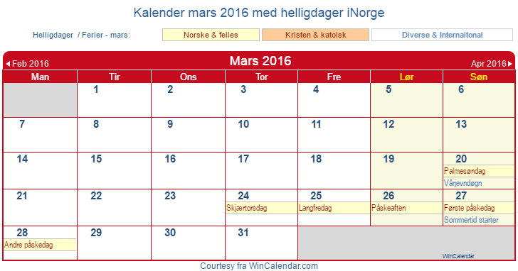 mars 2016 Kalender for å skrive ut - Norge