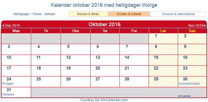 Tilbake til WinCalendar interaktiv NOR Kalender