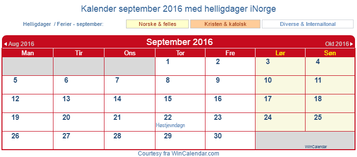 Tilbake til WinCalendar interaktiv NOR Kalender