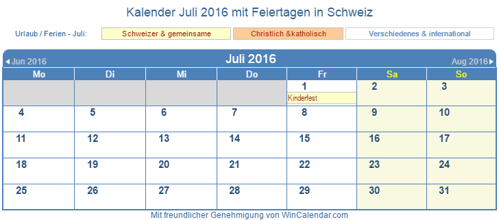 Kalender Juli 2016 mit Feiertagen zu drucken - SCHWEIZ