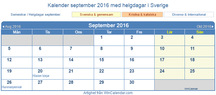 september 2016 kalender för att skriva ut - Sverige